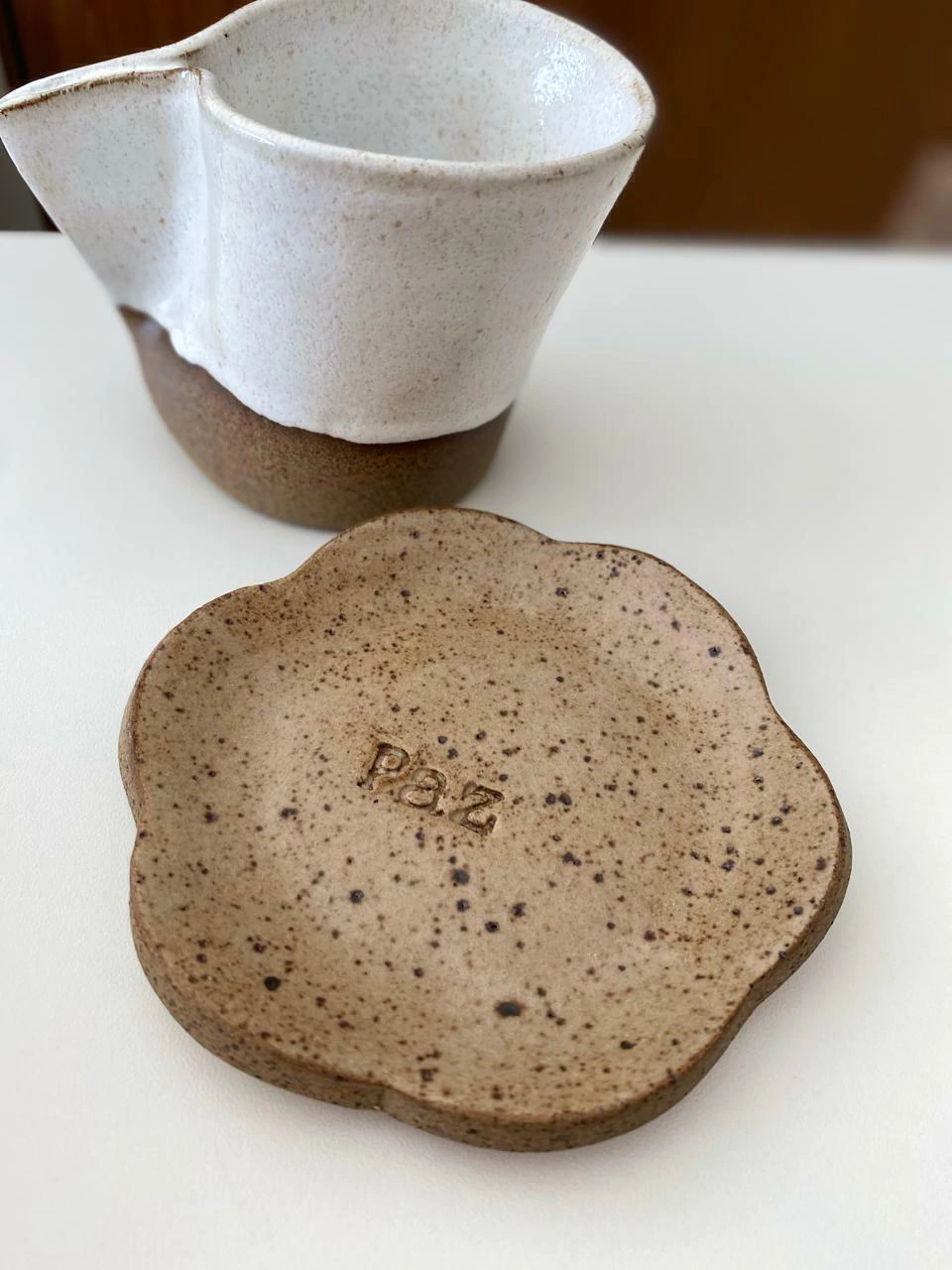 Um conjunto que une forma orgânica e significado. A xícara, com acabamento bicolor e linhas fluidas, traz leveza e autenticidade ao servir. O pires, em tom natural e textura pontilhada, carrega em relevo o desejo de “Paz”, transformando cada pausa em um ritual de intenção.