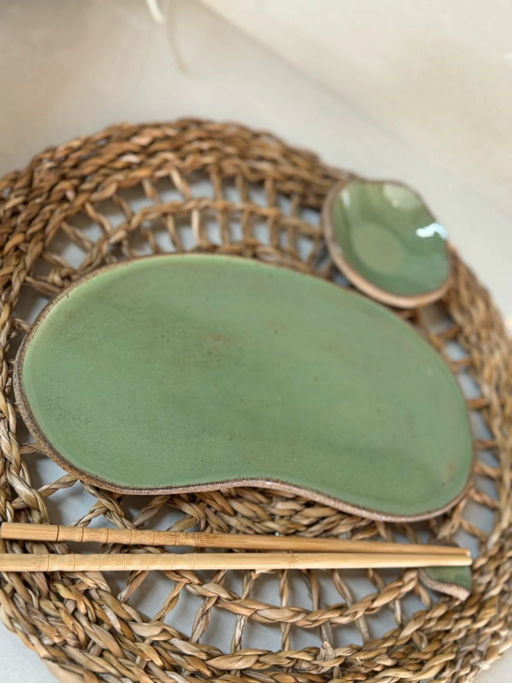 Conjunto em cerâmica artesanal no tom verde, com formas orgânicas que trazem leveza e autenticidade à mesa. Ideal para servir sushi, sashimi e acompanhamentos, proporcionando uma experiência única no dia a dia ou em ocasiões especiais.
