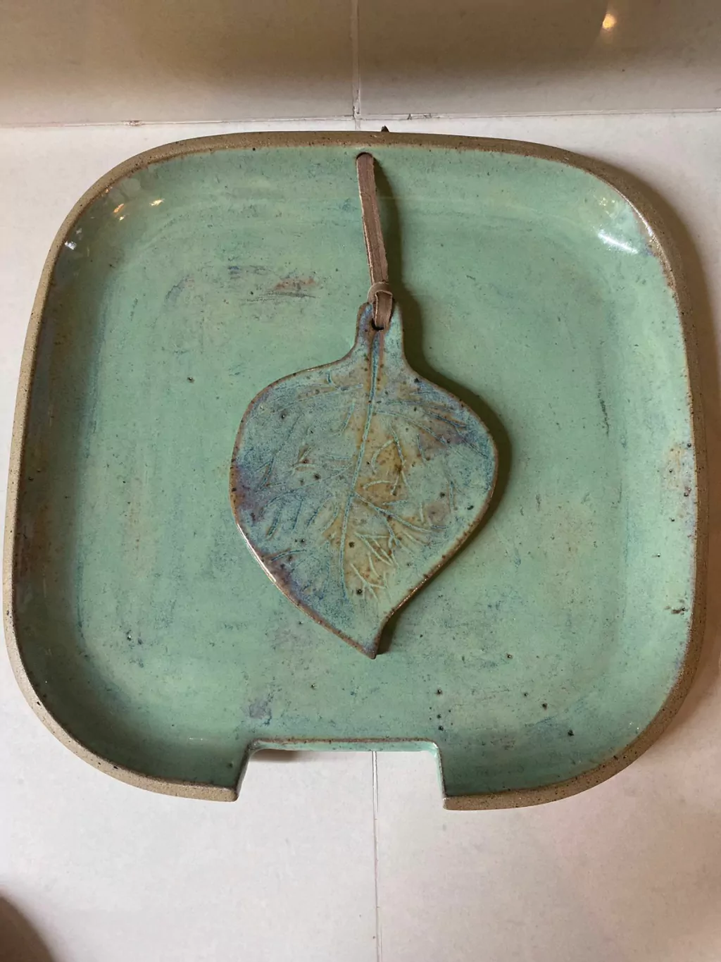 Peça em cerâmica artesanal, feita à mão, com detalhe em formato de folha e acabamento exclusivo que valoriza sua originalidade.