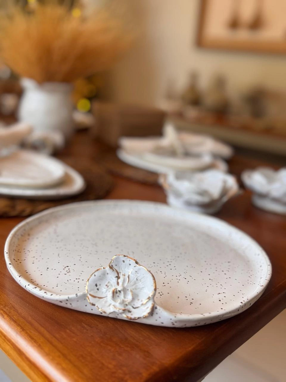 Um prato que celebra a leveza: linhas suaves, borda orgânica e a orquídea modelada à mão, finalizada com toques de ouro que iluminam a peça sem excessos. Uma composição serena, pensada para realçar o que você serve e trazer presença à mesa com sutileza